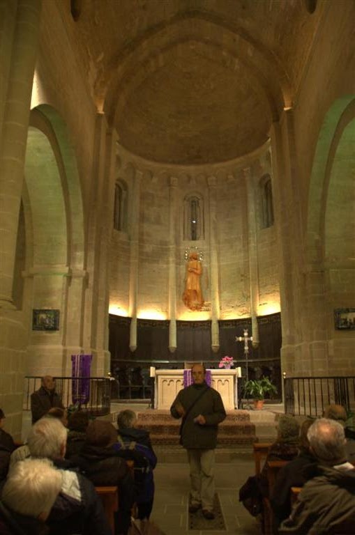 En primer lloc es va visitar l’església gòtica de Santa Maria. La planta de l’edifici és de creu llatina de tres naus, amb capelles entre els contraforts. Als braços del creuer hi ha tres capelles a cada costat i al deambulatori que encercla el presbiteri s’obren vuit capelles radials. La coberta, de volta de creueria i estrellada als extrems dels transsepte i al deambulatori, està suportada per deu pilars amb columnes adossades i capitells decorats amb motius florals. A l’extrem del braç nord del creuer s’aixeca la torre del campanar, de planta octogonal.