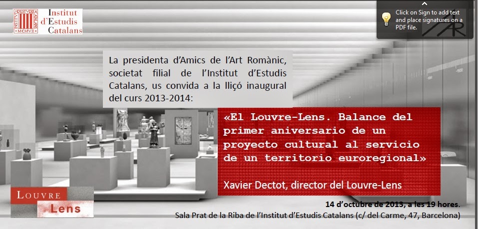 El passat dilluns 14 d’octubre del 2013 a les 19 hores, a la Sala Pere i Joan Coromines de l’Institut d’Estudis Catalans (C/Carme 47 – Barcelona) va tenir lloc la lliçó inaugural del curs 2013-2014 amb el tema «El Louvre-Lens. Balance del primer aniversario de un proyecto cultural al servicio de un territorio euroregional», a càrrec del Dr. Xavier Dectot, director de Louvre-Lens.L’acte va estar presentat per la Dra. Francesca Español, presidenta de la nostra entitat.