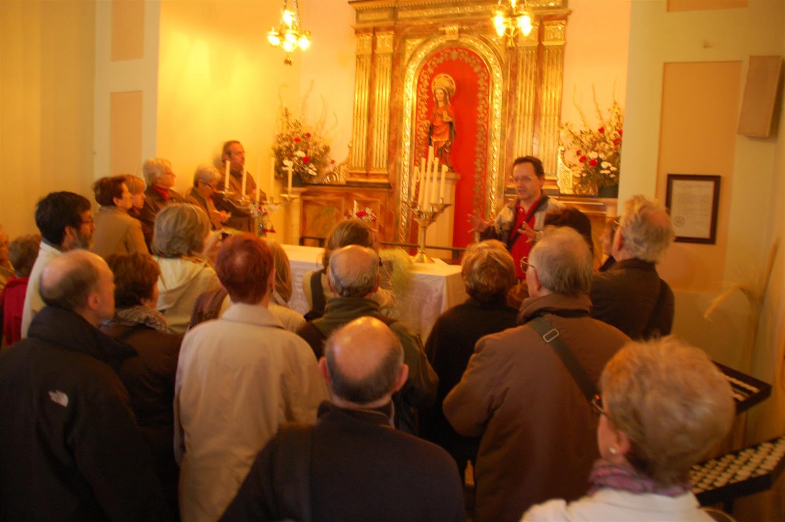 La visita va començar a l’església parroquial de Santa Maria on el Dr. Joan Valero va explicar dues de les imatges medievals que conté l’edifici. En primer lloc una imatge sedent de la Verge de la Llet, que malgrat presenta certs arcaismes en la representació es pot situar a l’època gòtica. En segon lloc, una talla del gòtic internacional que representa a Santa Magdalena i que es pot relacionar amb el taller de Pere Sanglada. Valero va ressaltar que presenta un paral·lel clar amb altres obres d’aquest autor, com per exemple la imatge homònima de la trona de la catedral de Barcelona.