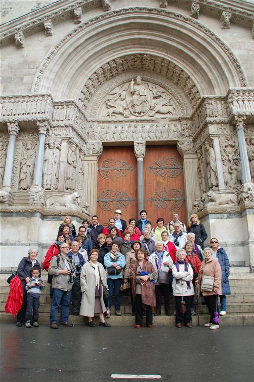 Després de dinar es va anar a visitar Arle, l’anomenada capital de la Camarga, es a dir la planícia entre els dos braços del Roine, que es caracteritza per les salines, els arroçars, els ocells, els cavalls i els toros. Durant aquest trajecte la Sandra Cabrespina i la Guadalupe Miras van llegir uns fragments del llibre “Camins de França” de Puig i Ferreter. La ciutat d’Arle és una ciutat antiga amb molta història, es creu que podria ser d’origen grec, i es sap que va ser ocupada pèls celtes abans d’esdevenir una colònia romana, que amb el temps va acollir els veterans de la sisena legió d’August. La ciutat estava en festes i molt animada, però el centre d’interès va ser es clar, l’església de Sant Tròfim, construïda al segle XII sobre l’emplaçament d’una basílica inicial del segle V, dita de Sant Esteve i antiga catedral. Es va poder visitar el claustre, que llueix esplèndides escultures en els capitells i en els pilars angulars de la galeria nord. I des d’aquest claustre es va admirar el campanar.